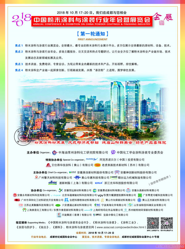 熱烈祝賀華夢(mèng)噴涂應(yīng)邀參加2018年中國粉末涂料與涂裝行業(yè)年會(huì)暨展覽會(huì) 此會(huì)議將于10月17日在成都召開[2018-9-27]
