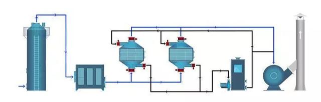 (2)完成解吸脫附以后活性炭吸附器Ⅰ進入待用狀態(tài),待活性炭吸附器Ⅱ接近飽和時,系統(tǒng)再自動切換回來,同時對活性炭吸附器Ⅱ進行解吸脫附,如此循環(huán)工作。